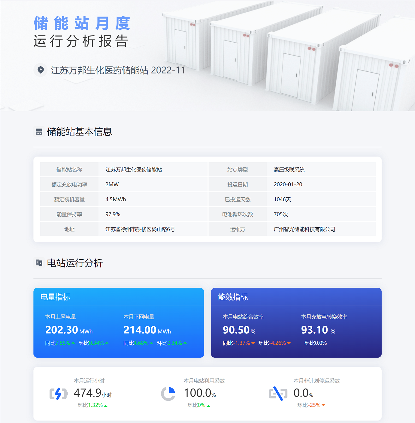自动生成电站运行分析报告,对储能站整体运行数据、故障告警、电池健康度、电池寿命等进行大数据统计分析形成综合评估报告,为储能站运行、运维提供辅助决策。