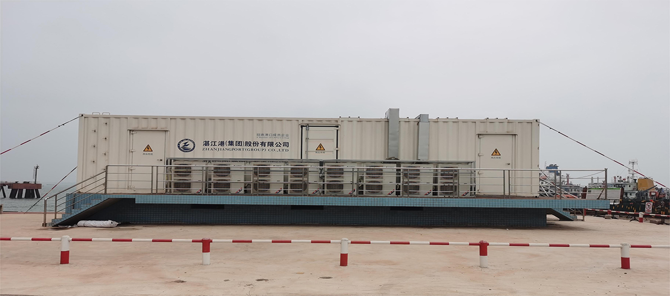 湛江某电力公司煤码头岸电项目,岸基电源系统容量为1250kVA,可同时输出6.6kV高压及440V低压岸电电源,满足不同类型船舶用电需求。系统主要包括变频电源系统、自动化控制及监控系统和码头岸电电缆提升装置三大部分,通过岸基电源与船舶自身供电系统连接后的同步并网、切换等流程,实现岸基电源给船舶供电。